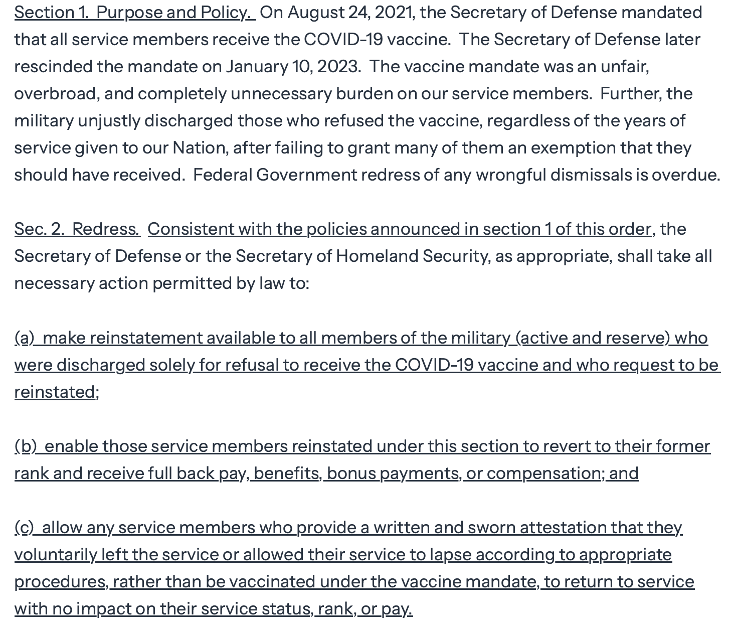 President Donal Trump issued an Executive Order to reinstate military personnel that were involuntarily separated due to refusal to take the Covid 19 jab. This EO seems to expressly set conditions to “justice” that read more like leverage than good faith.